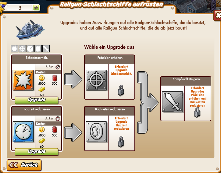 The expansion of their naval force through the material collected is now unlocked, you can improve them now. You have to invest a lot of upgrades for the individual coins, oil and ores. The power struggle, the final upgrade, you can often unlock only with Empire points.